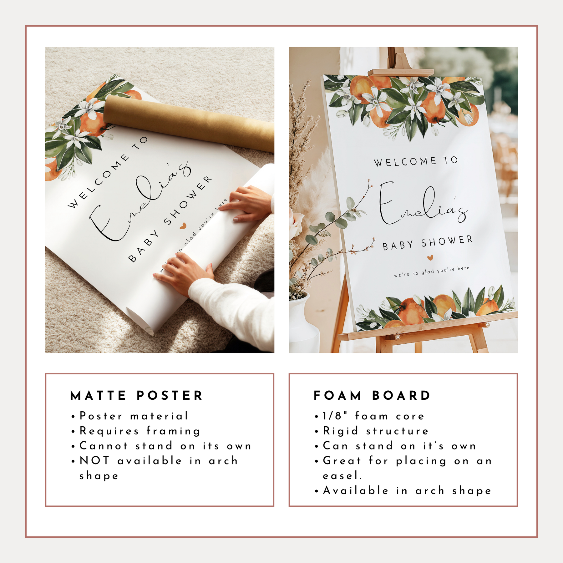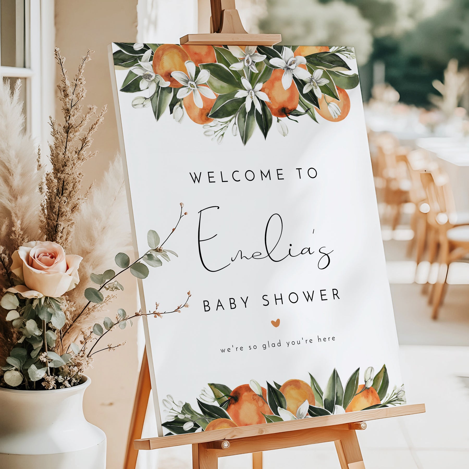 This Little Cutie baby shower welcome sign features cute watercolor clementines and greenery with elegant script font. Perfect for your Clementine themed baby shower celebration.