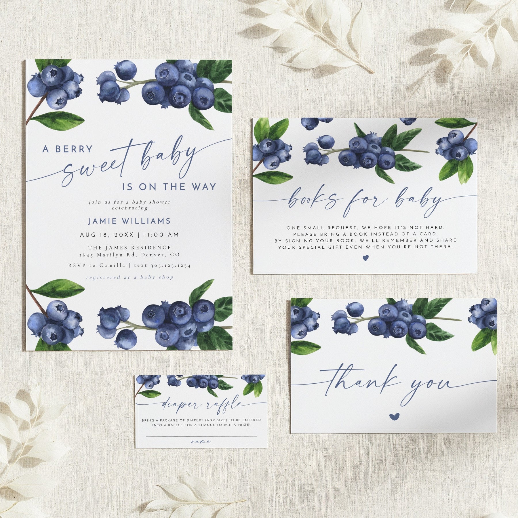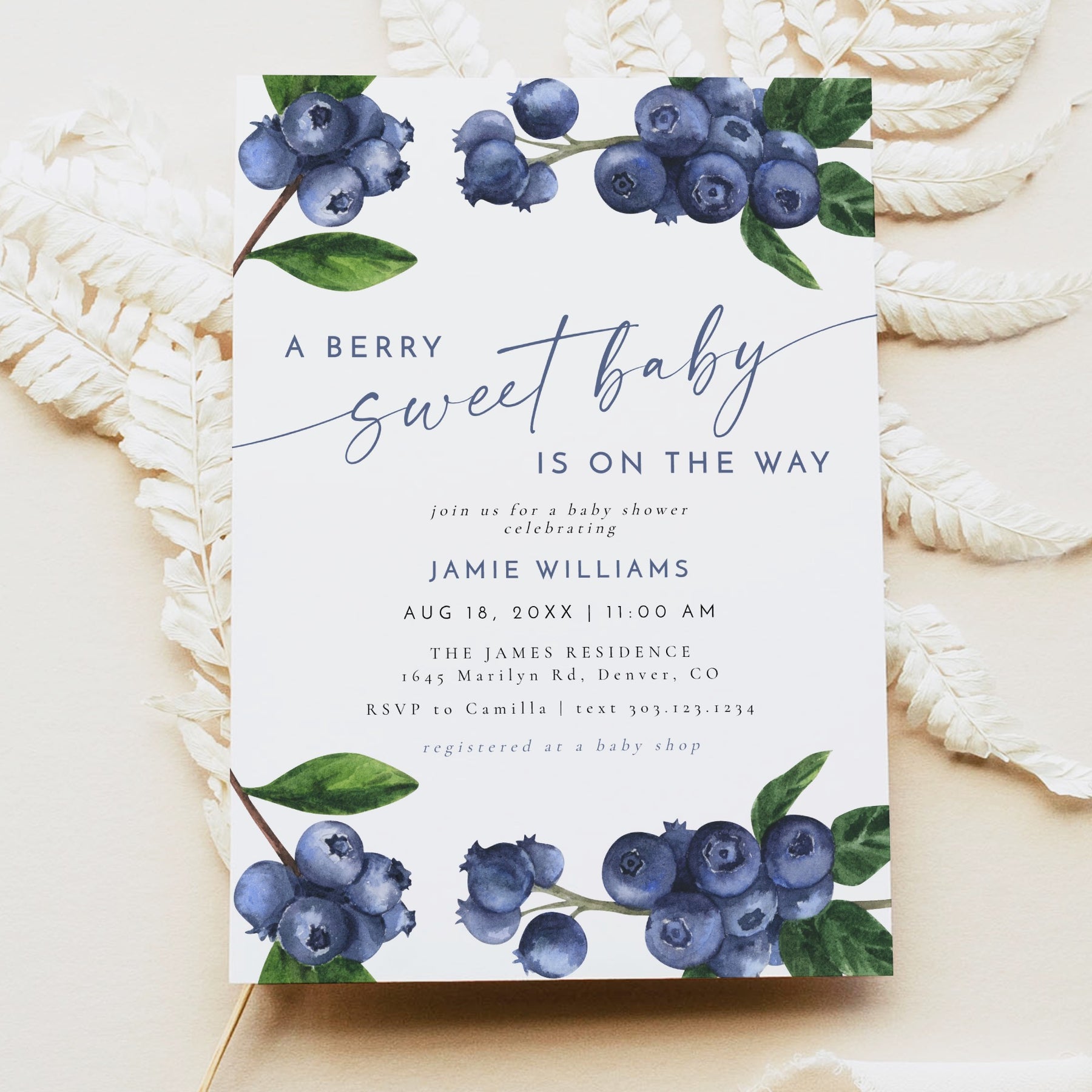 This printed and shipped A Berry Sweet Baby On the Way baby shower invitation suite features watercolor blueberries and a boho font combination. Perfect for your blueberry theme baby shower.