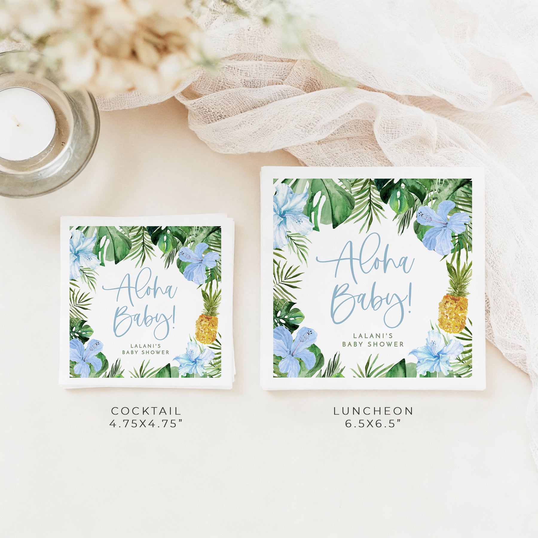 This printed and shipped baby shower napkins features tropical blue hibiscus and palm leaves with a fun script font.