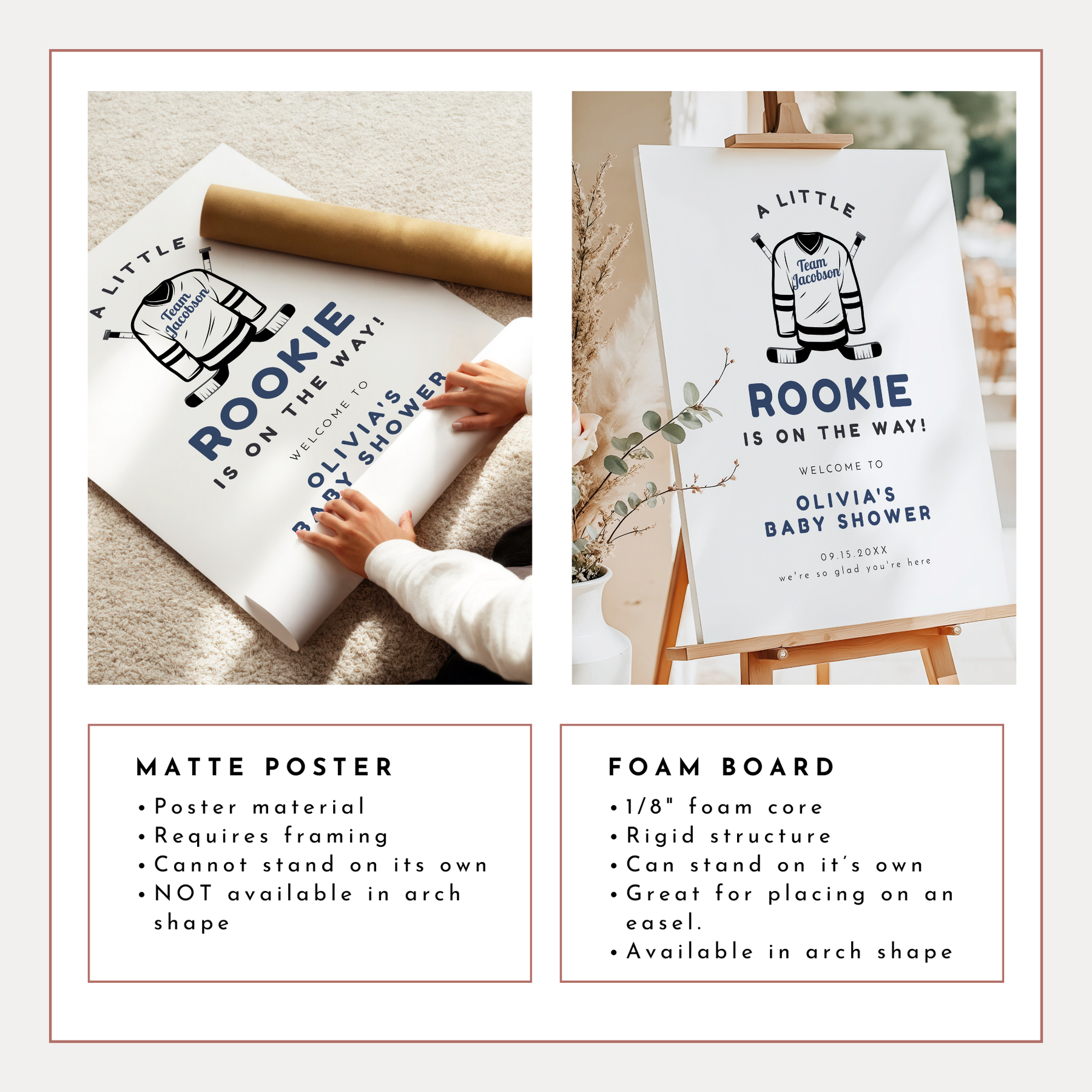 This Little Rookie on the Way baby shower welcome sign features hockey jersey, hockey sticks and a classic font. Perfect for your Little Rookie Hockey themed baby shower celebration.