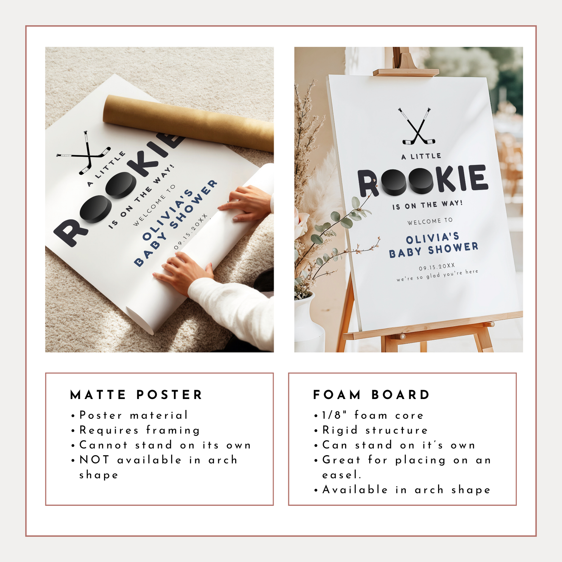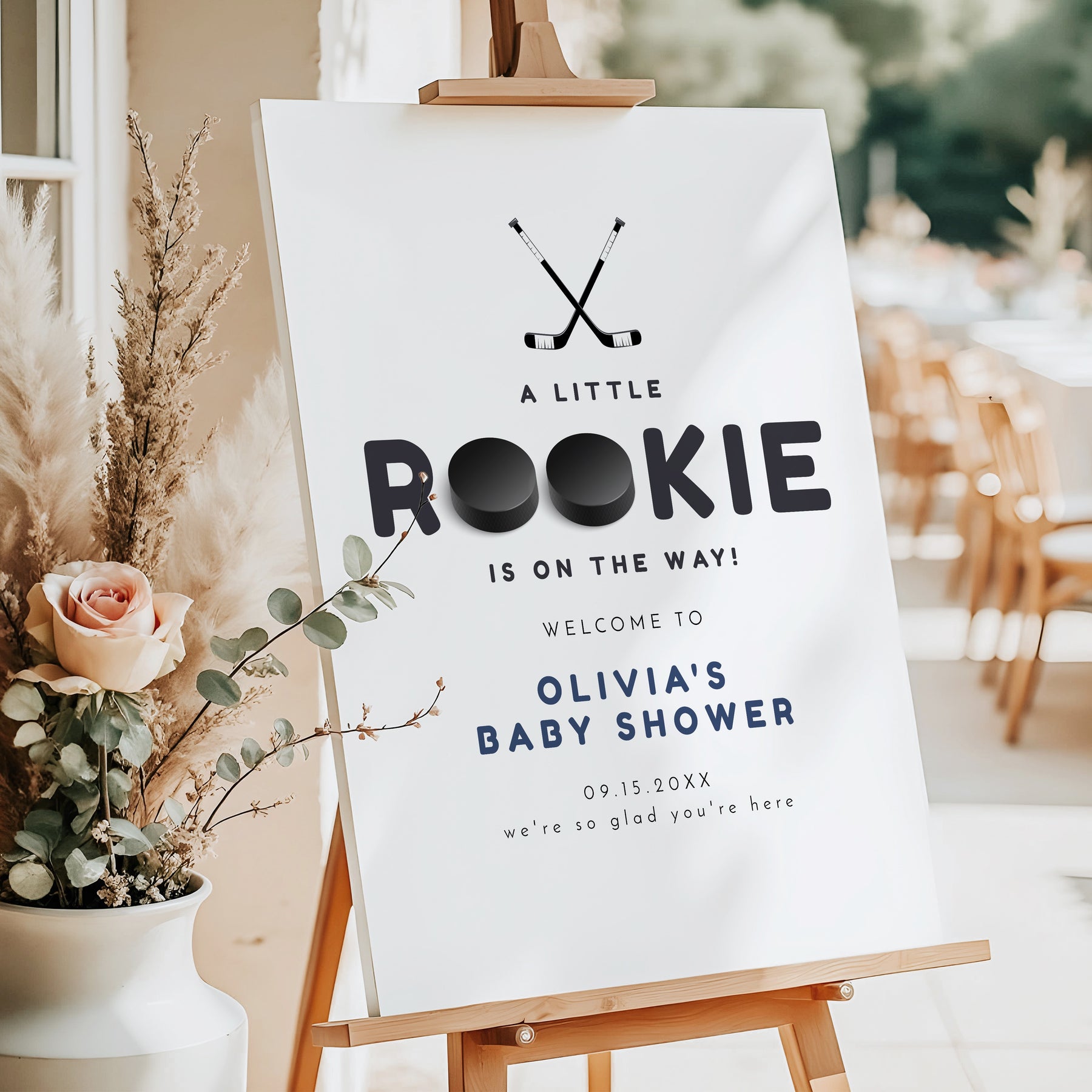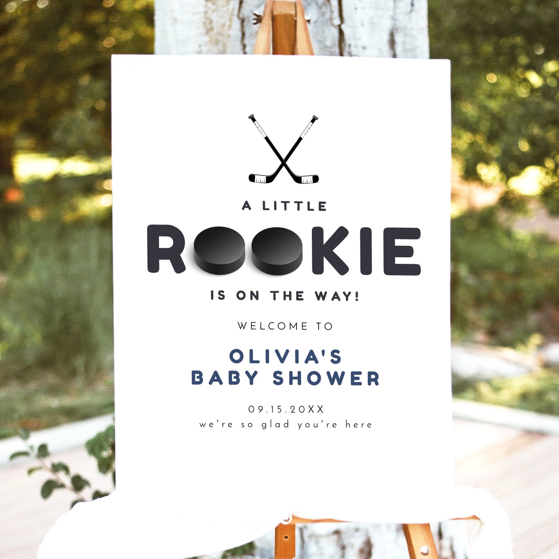 This Little Rookie on the Way baby shower welcome sign features hockey pucks and a classic font. Perfect for your Little Rookie Hockey themed baby shower celebration.