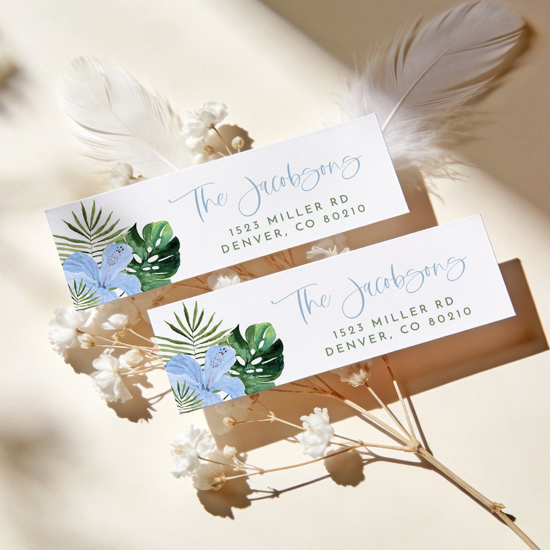 This return address label features tropical blue hibiscus and palm leaves with a fun handwritten font. Perfect for your tropical or luau themed baby shower.