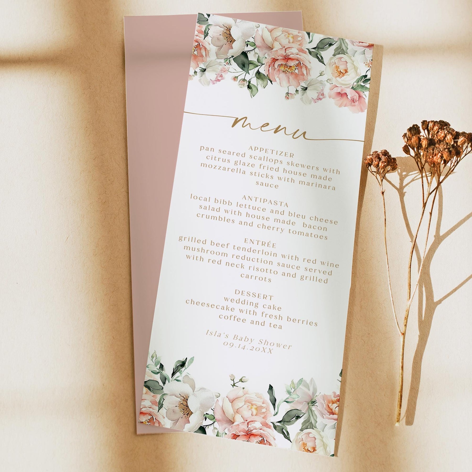 ISLA Blush Floral and Gold Table Menu