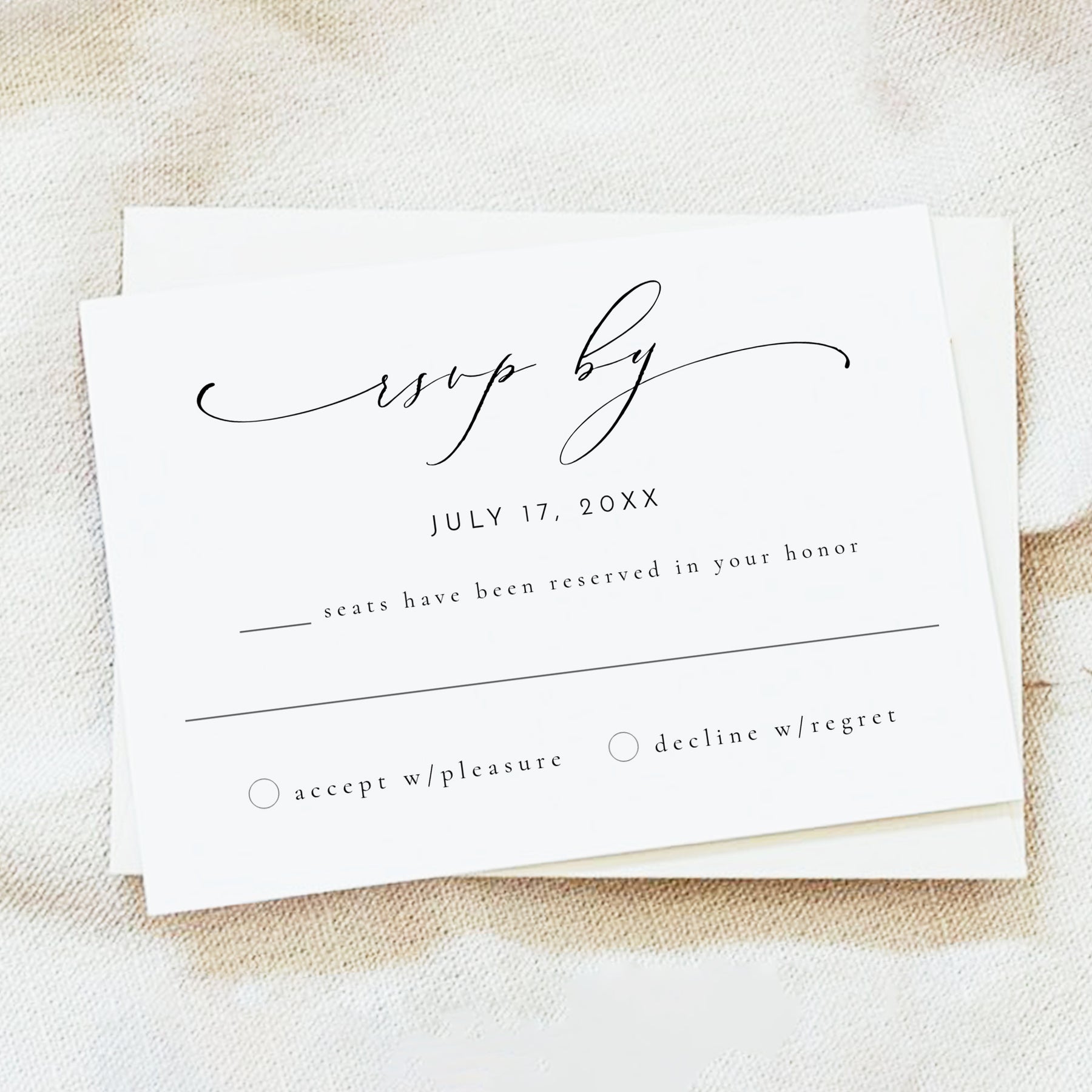This printed and shipped wedding RSVP card features a classic minimalist design with an elegant calligraphy script font and includes white straight-flap envelopes.