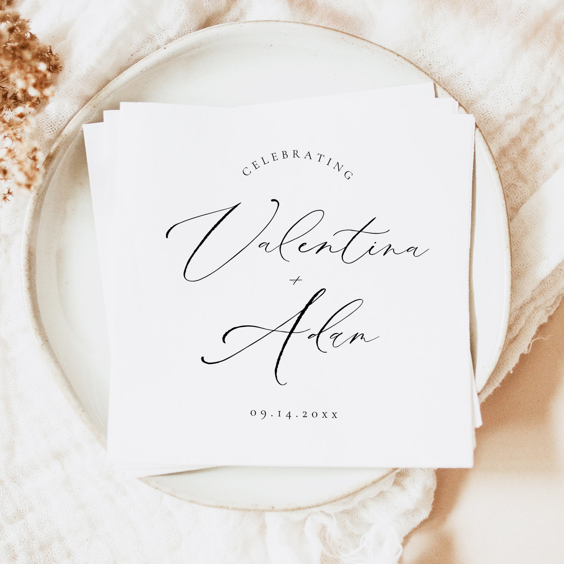 These napkins feature an elegant script font and modern minimalist layout that's perfect for an elegant wedding celebration.