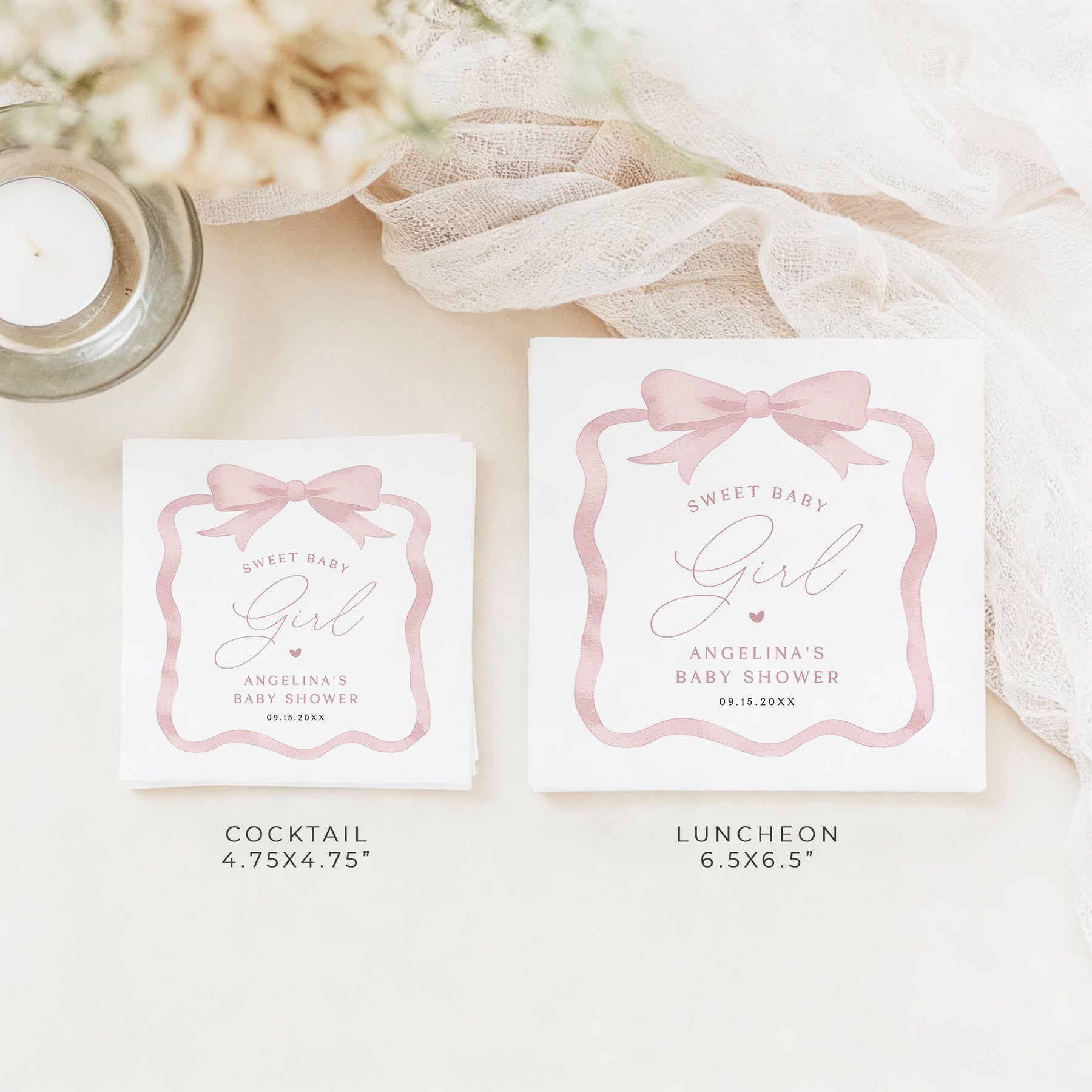 These Sweet Baby Girl baby shower paper napkins feature a pink watercolor bow and an elegant script font. Perfect for your upcoming baby shower celebration.