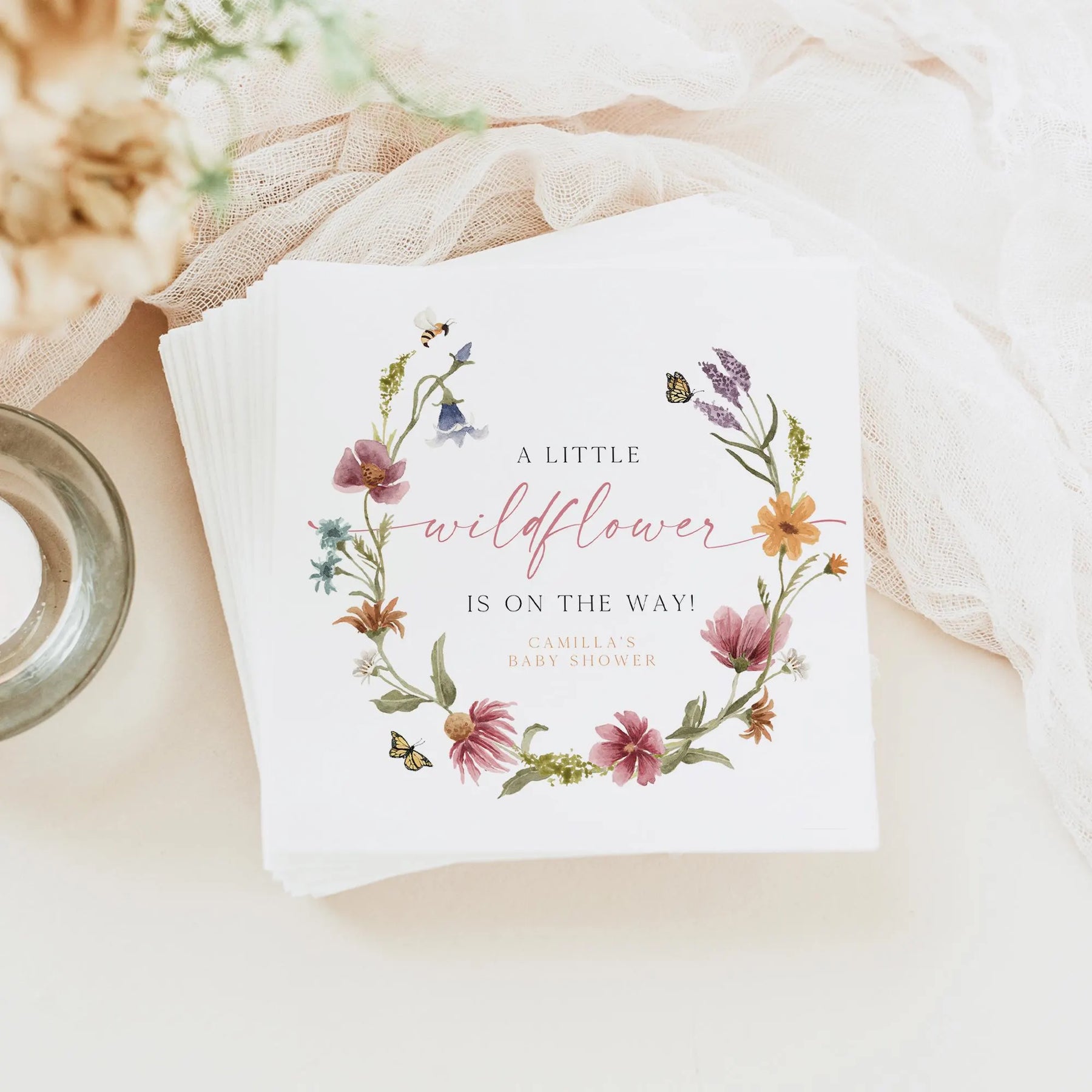 These baby shower paper napkins feature wildflowers and a boho font.