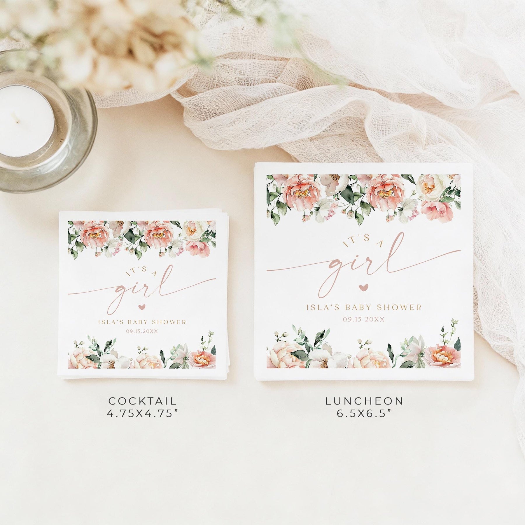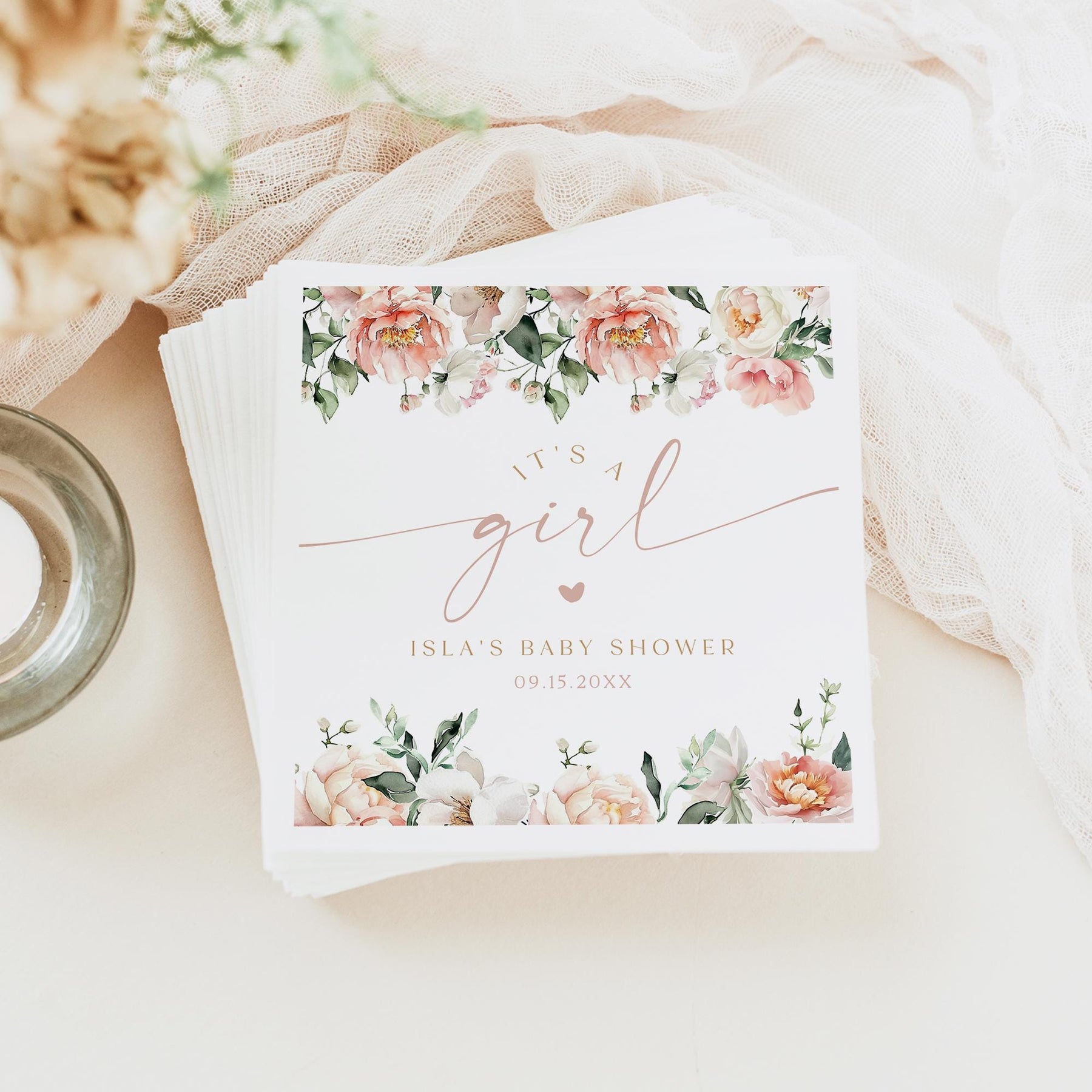 This baby shower napkin features blush floral with an elegant font combination and the phrase, "it's a girl".
