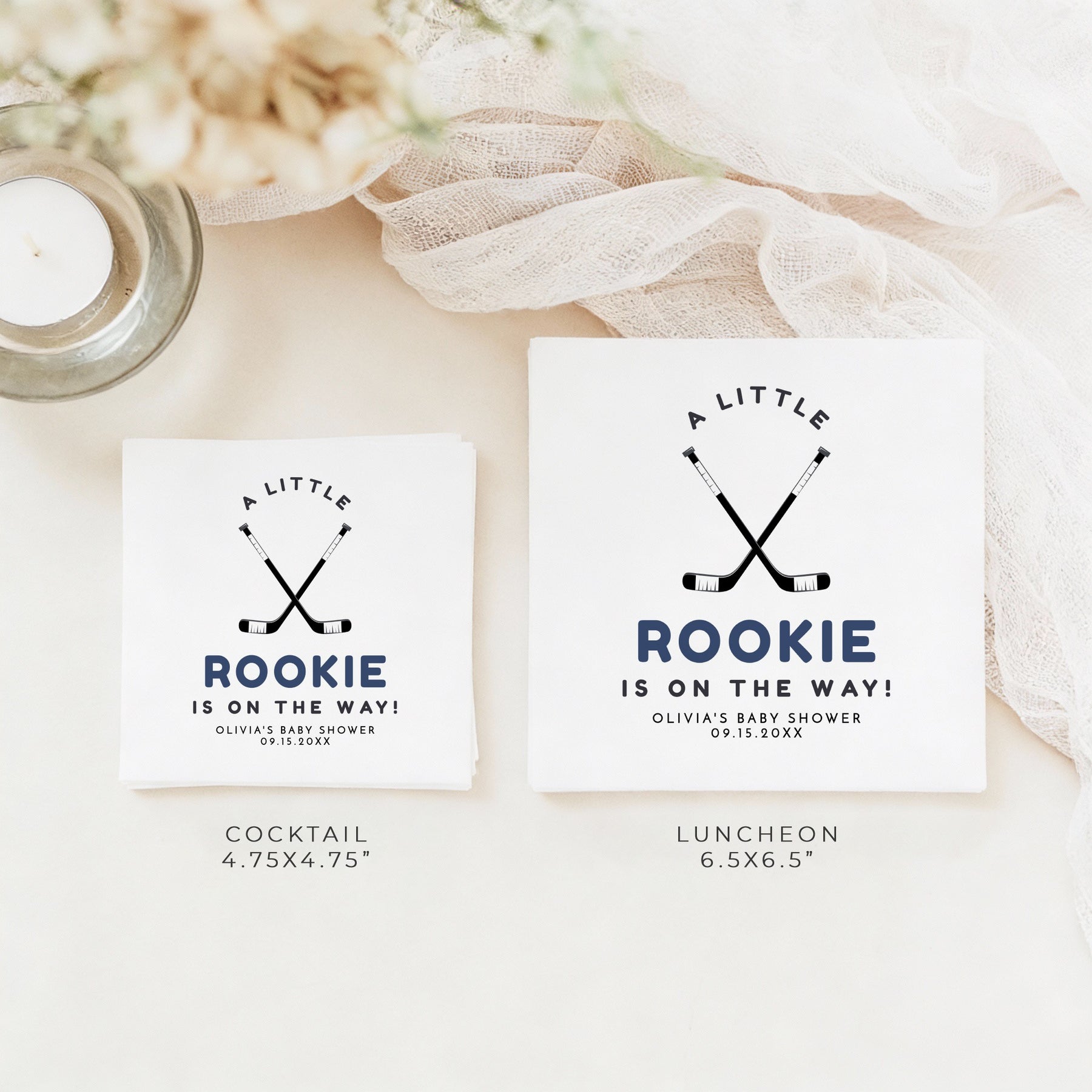 This baby shower paper napkin features hockey sticks and a classic font combination. Perfect for your little rookie baby shower celebration.