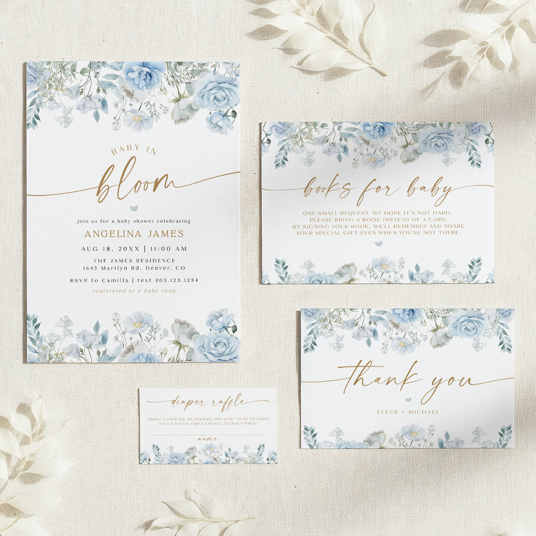 FLEUR Dusty Blue Floral Baby Shower Invitation Suite