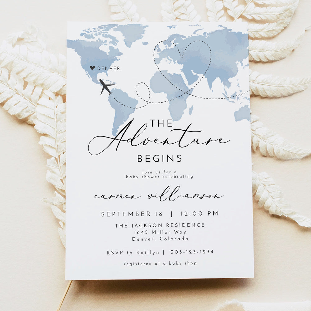 CARMEN Dusty Blue Map Adventure Begins Baby Shower Invitation Suite