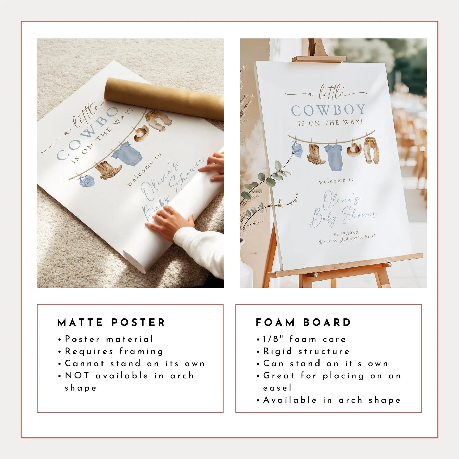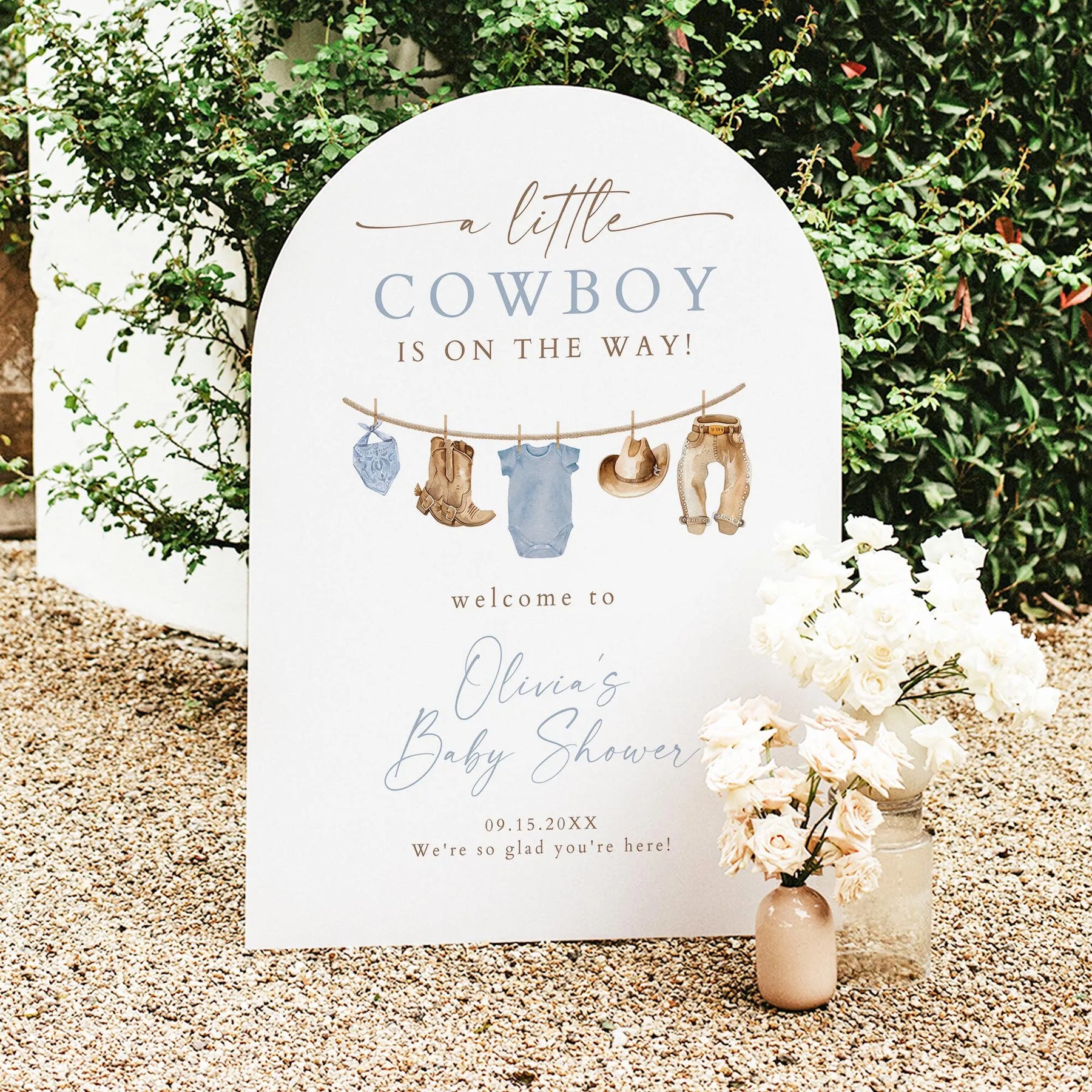 The Clint baby shower welcome sign features cute baby cowboy clothes on a line and a modern boho font combination.