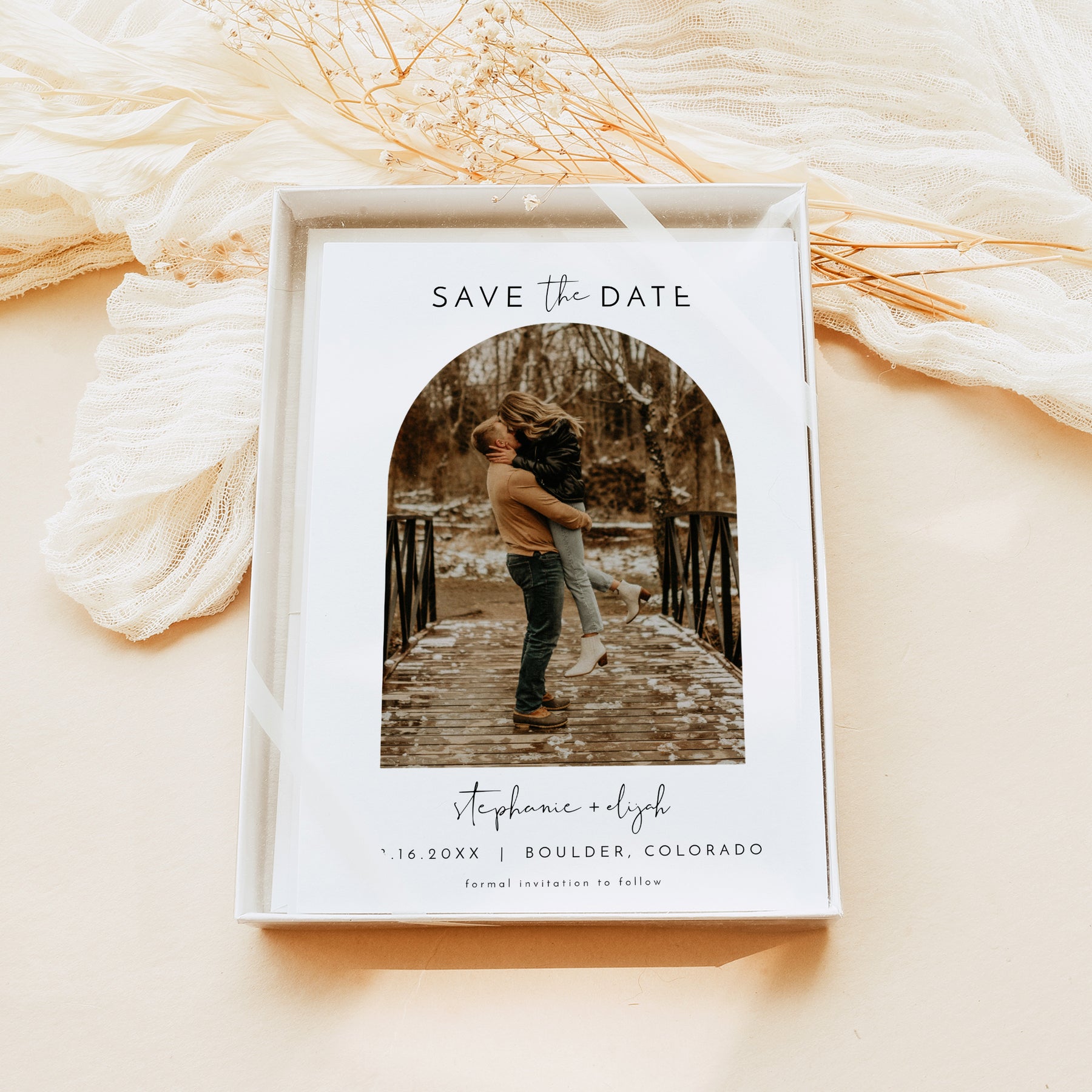 This printed and shipped wedding save the date features an edgy handwritten font and modern minimalist design with an arch photo on the front and a full backside photo.