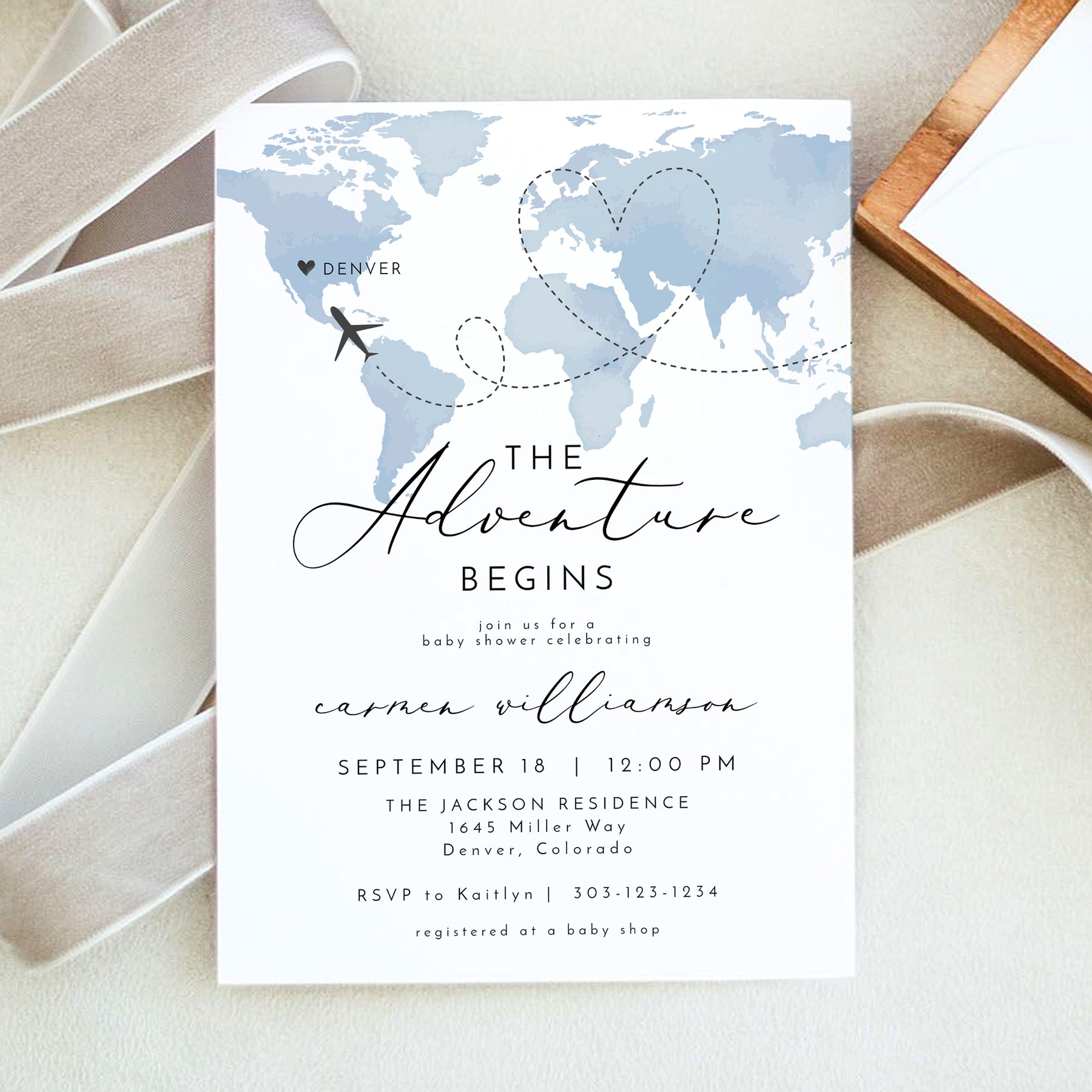 This baby shower invitation features a dusty blue watercolor world map and elegant font combination. It's perfect for a travel or adventure themed baby event.