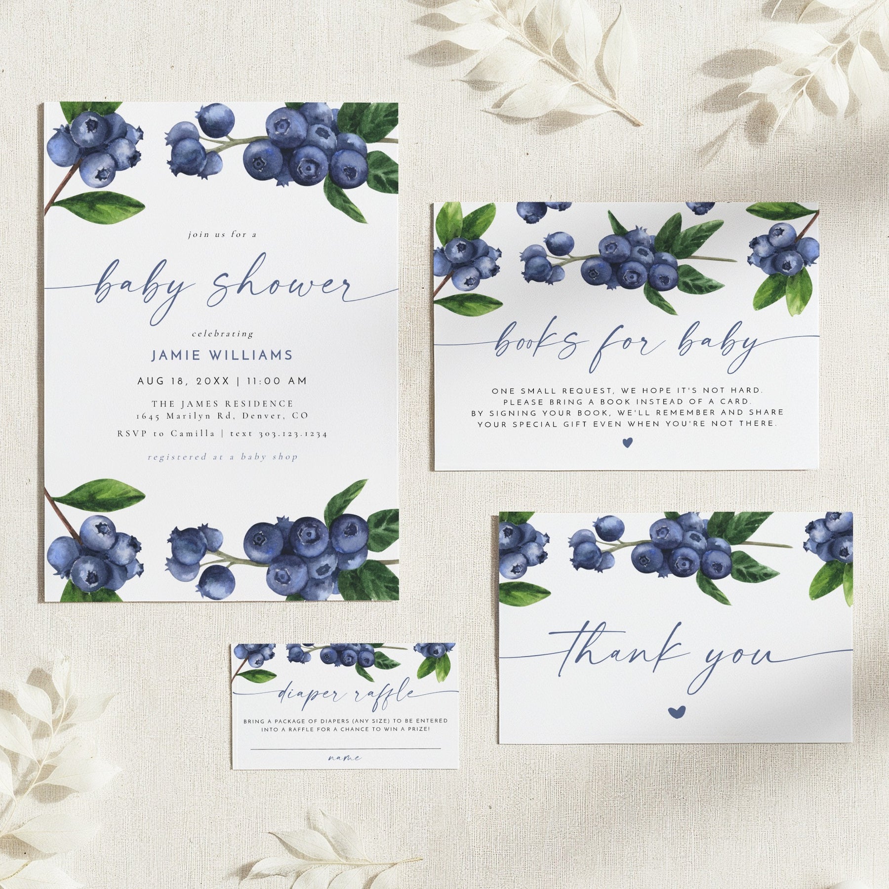 This printed and shipped A Berry Sweet Baby On the Way baby shower invitation suite features watercolor blueberries and a boho font combination. Perfect for your blueberry theme baby shower.