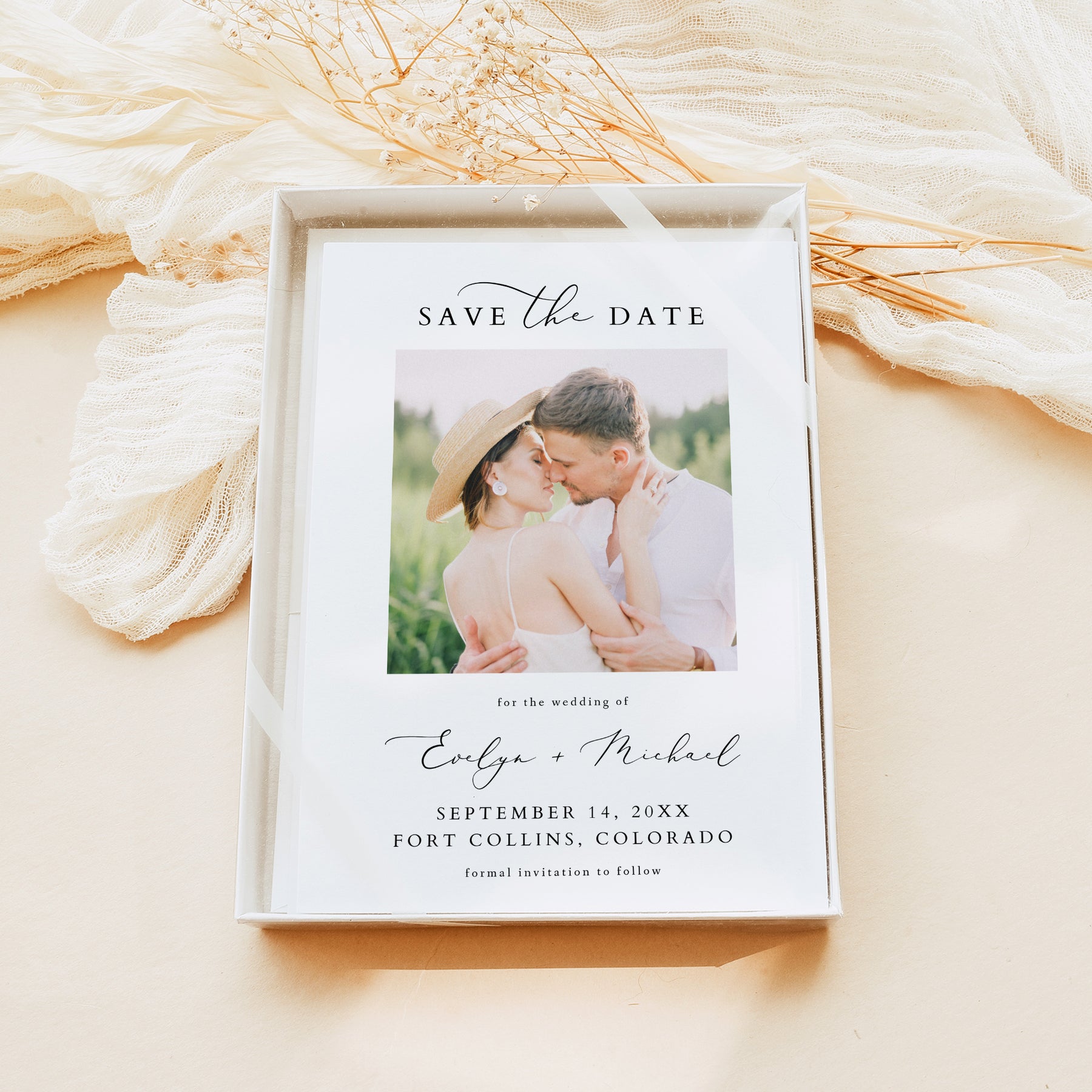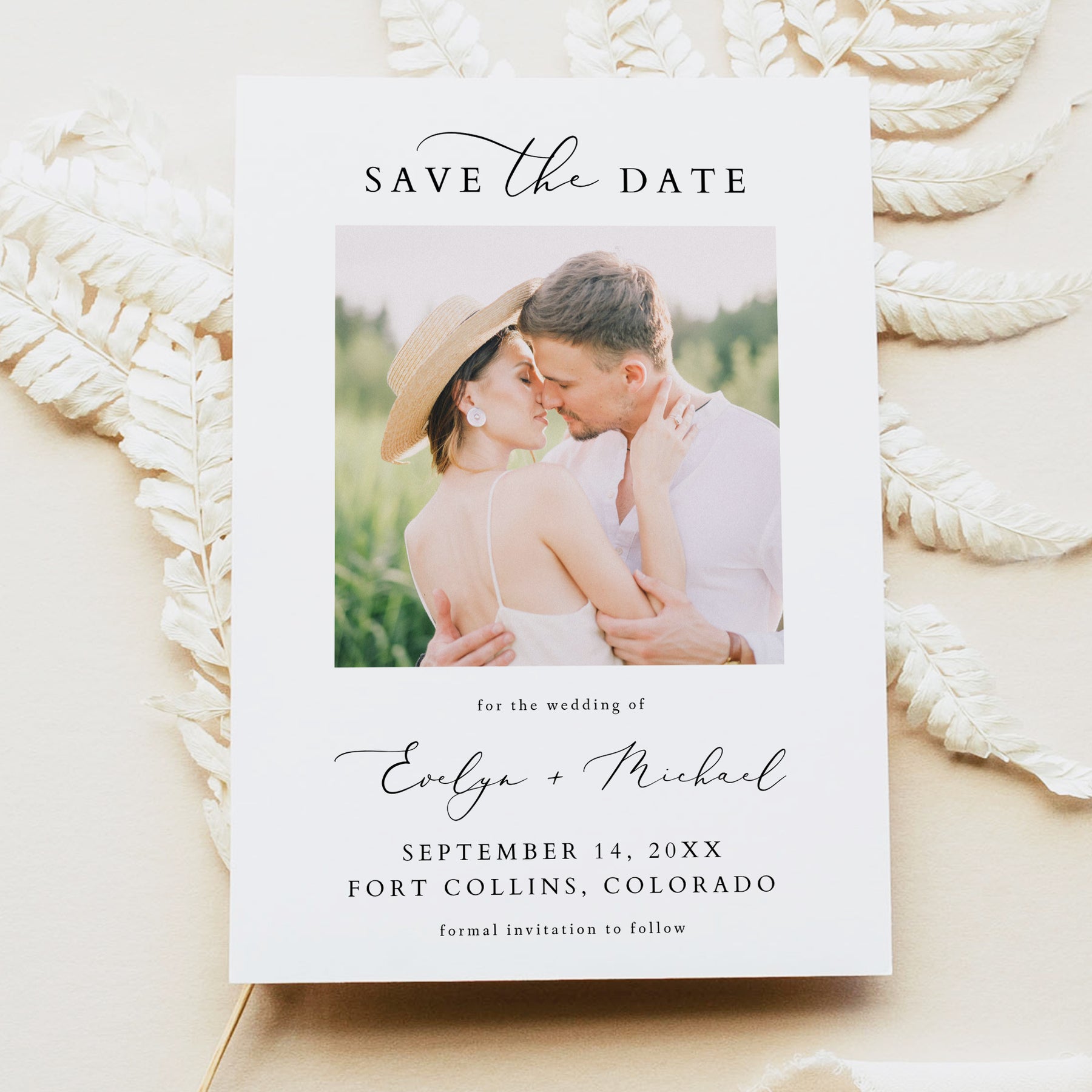 This printed and shipped wedding save the date card features an elegant script font, modern minimalist design, and engagement photos on both sides.