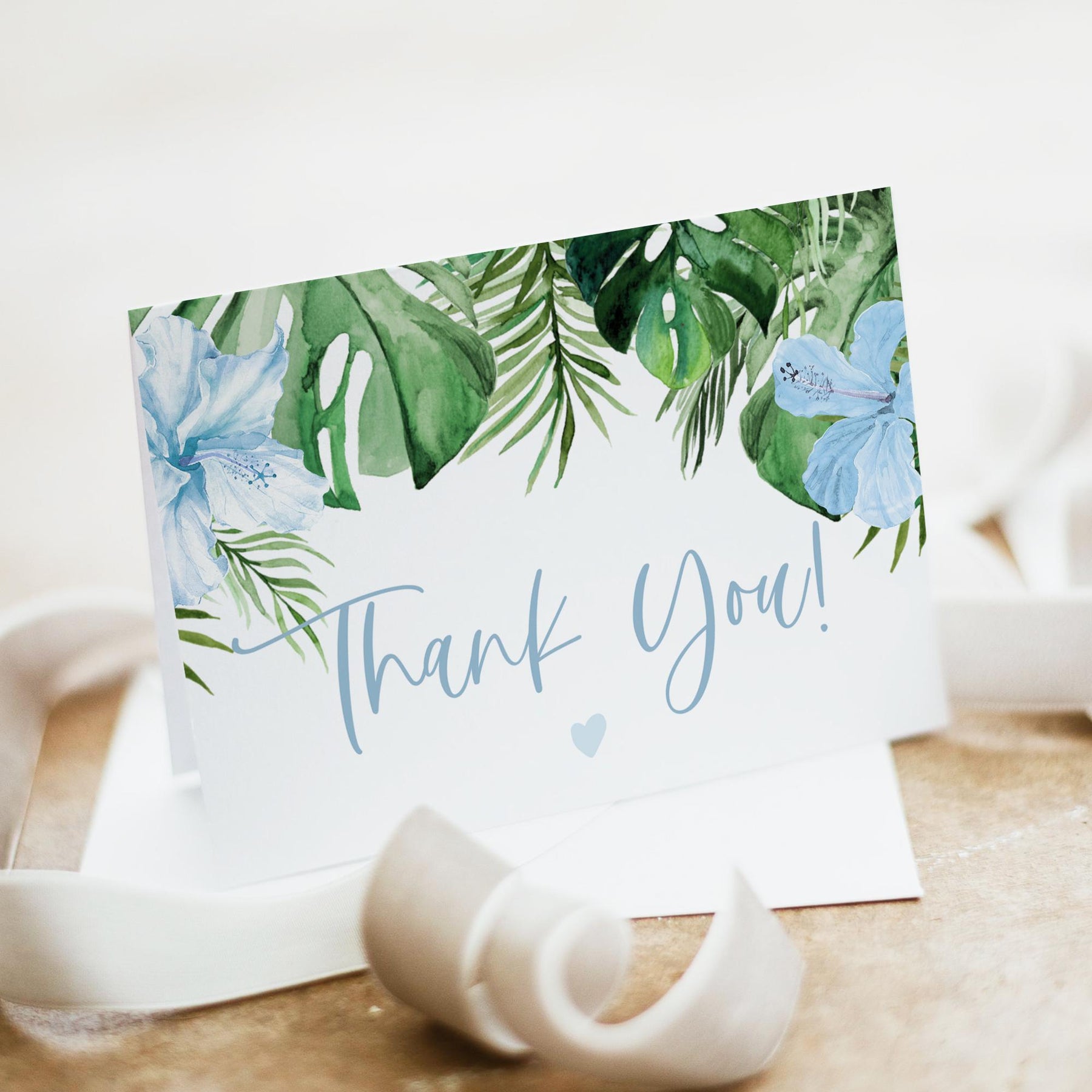 This baby shower invitation suite features blue tropical hibiscus florals, pineapple, and palm leaves with a fun boho font. It's perfect for your Aloha baby baby shower or Luau beach themed event.