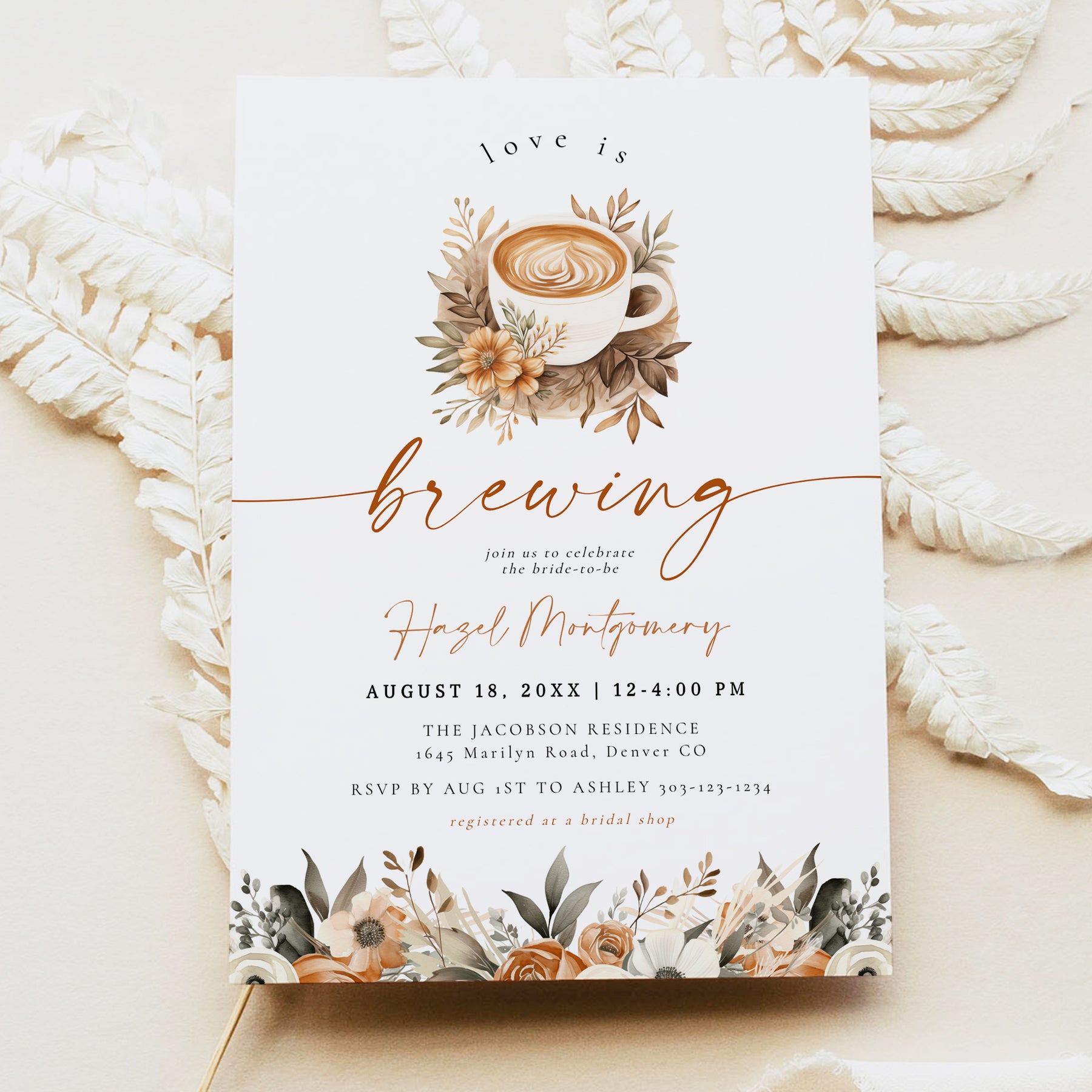 This bridal shower invitation features boho terracotta florals and a cute watercolor coffee graphic. It's perfect for a "love is brewing" bridal event.