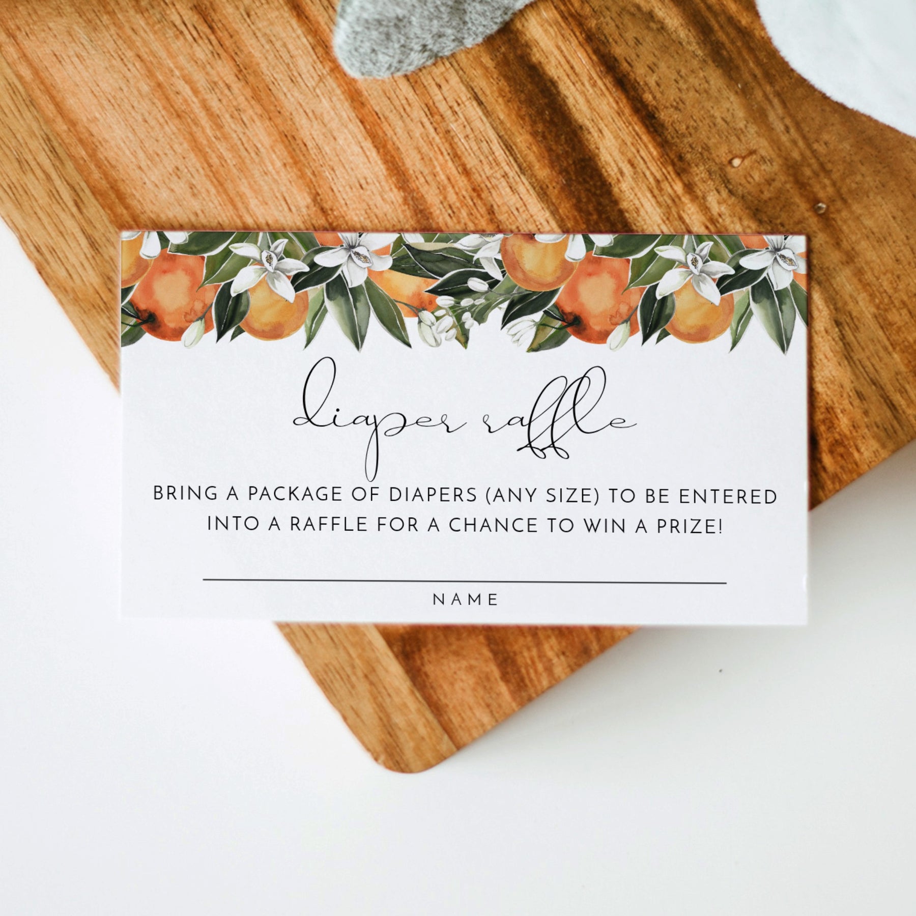 This printed and shipped baby shower diaper raffle ticket features watercolor cutie clementine with white florals and green leaves paired with a fun boho font. Perfect for your orange or fruit themed gender neutral baby shower.