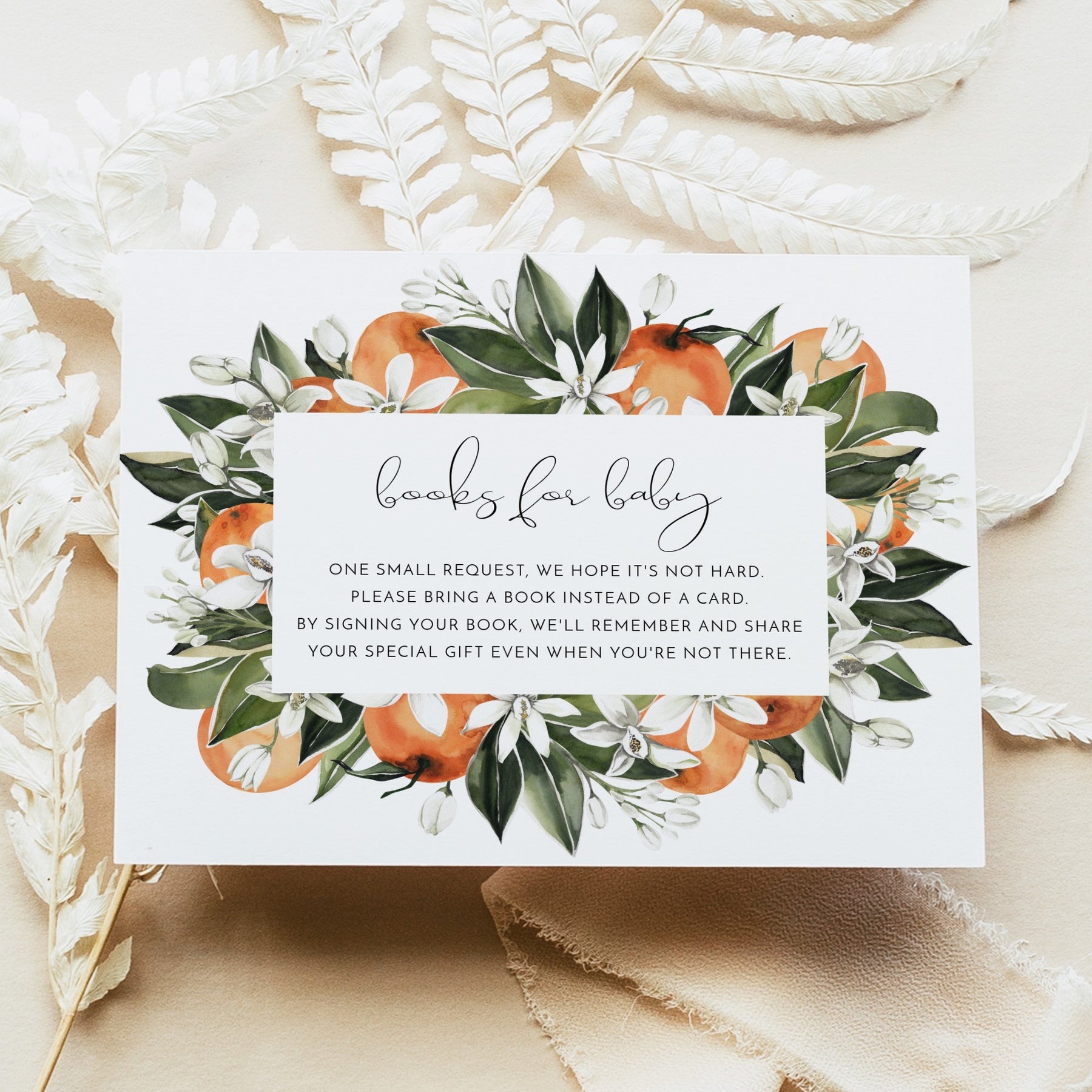 This printed and shipped baby shower books for baby insert card features watercolor cutie clementine with white florals and green leaves paired with a fun boho font.
