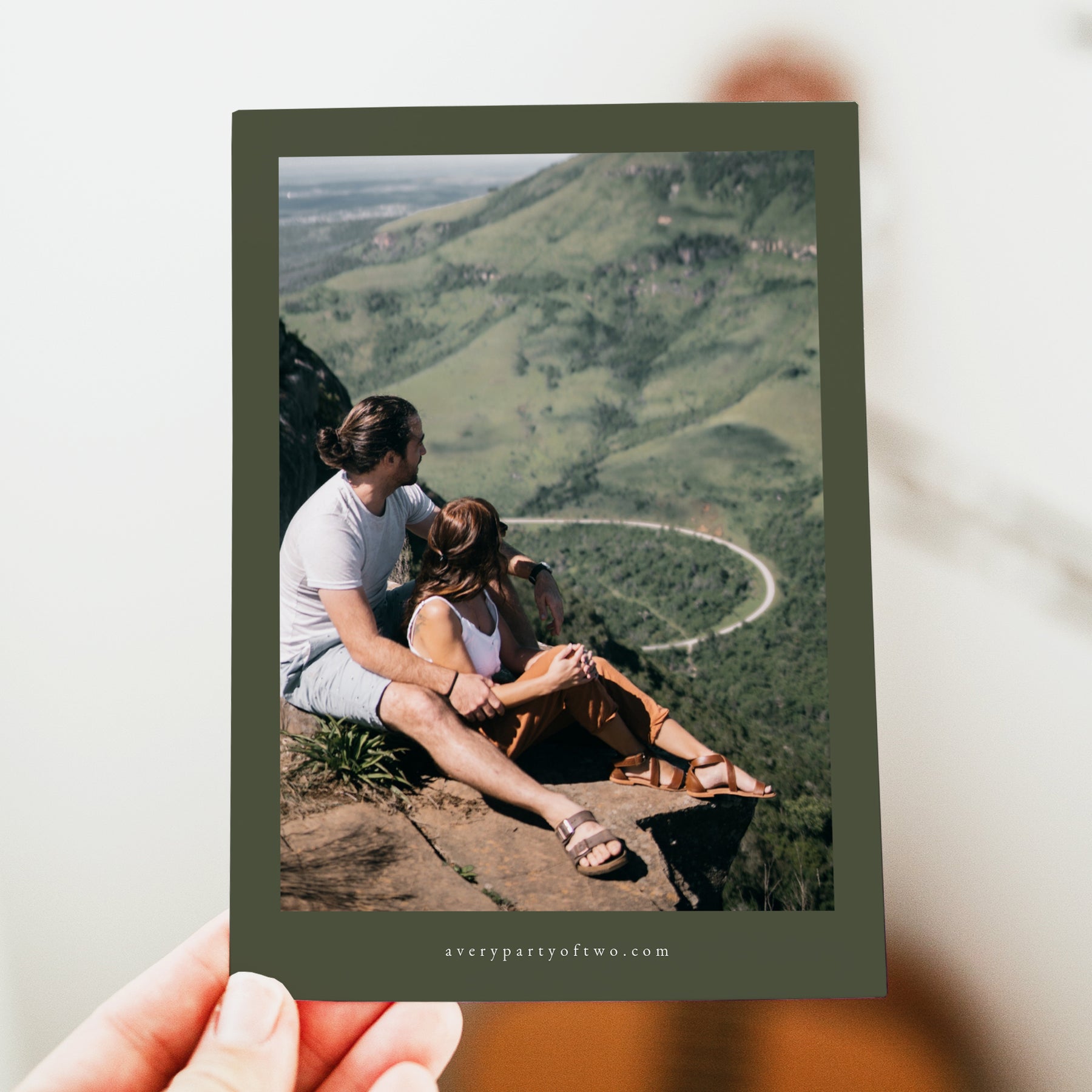 This printed and shipped Save the Date card features a watercolor mountain lake landscape with soft, natural tones, an elegant script font, and personalized engagement photos printed on both sides.