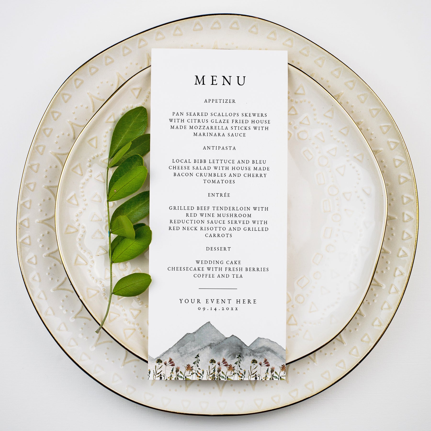 This printed and shipped menu features watercolor mountains and wildflowers paired with a clean, modern layout. Perfect for an outdoor wedding, rehearsal dinner, or engagement party event.